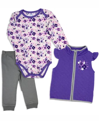 Baby Girls Floral Bodysuit, Pants And Vest, 3 Piece Set In Purple