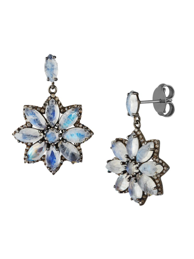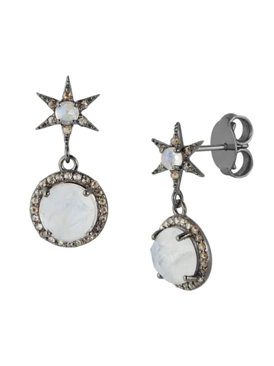 Women's Black Rhodium Plated Sterling Silver, Rainbow Moonstone & Brown Diamond Drop Earrings