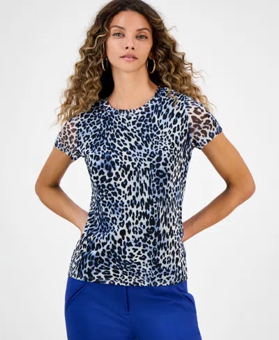 Women's Leopard-print Short-sleeve Mesh Top, Macy Exclusive In Blue