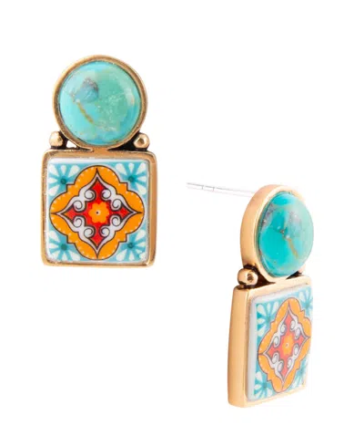 Talavera Tile Blue Turquoise Golden Drop Earrings