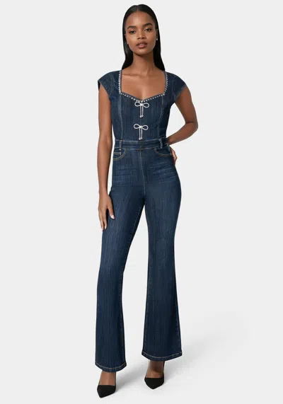 Embellished Neckline Flared Leg Denim Jumpsuit In Dark Indigo Wash