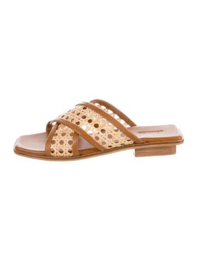 Pre-owned Raffia Leather Trim Embellishment Slides In Brown