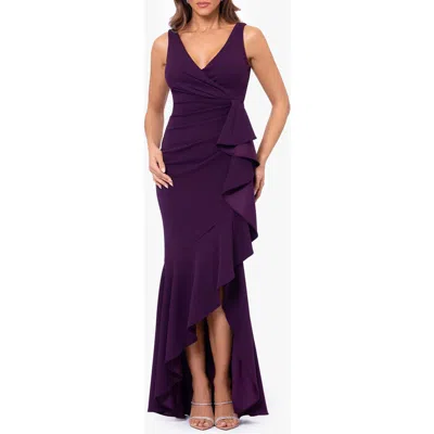 V-neck Cascade Ruffle High-low Gown In Navy In Blue