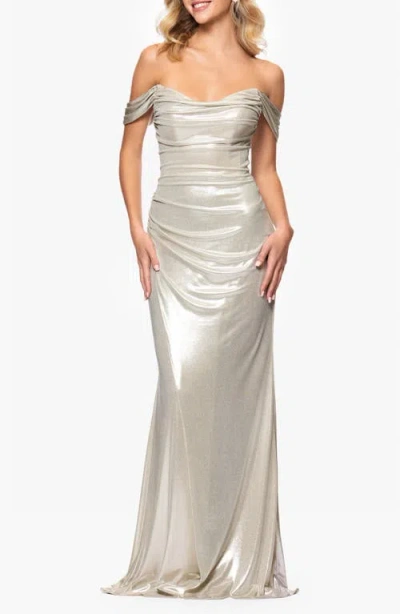 Women's Glitter Knit Off-the-shoulder Gown In Champagne
