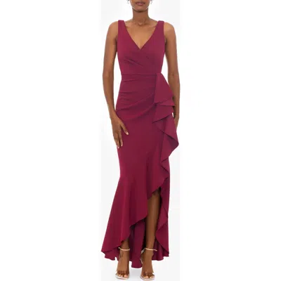 V-neck Cascade Ruffle High-low Gown In Bordeaux