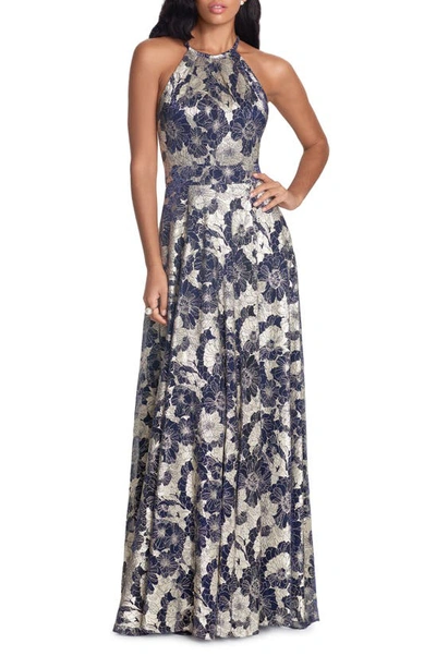 Metallic Floral Halter Top Gown In Blue