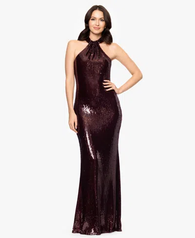Women's Long Sequined Halter Neck Gown In Burgundy