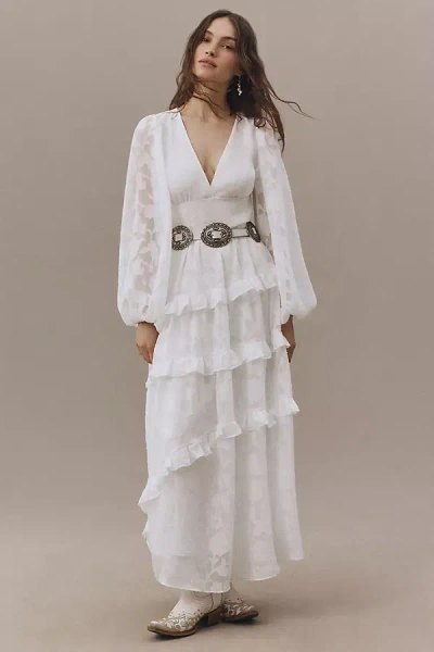 Long-sleeve V-neck Jacquard Maxi Dress In White
