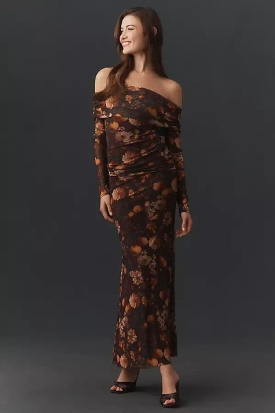 Off-shoulder Long-sleeve Ruched Maxi Dress In Brown