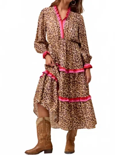 Leopard Printed Midi Dress With Contrast Stripe In Beige In Sand