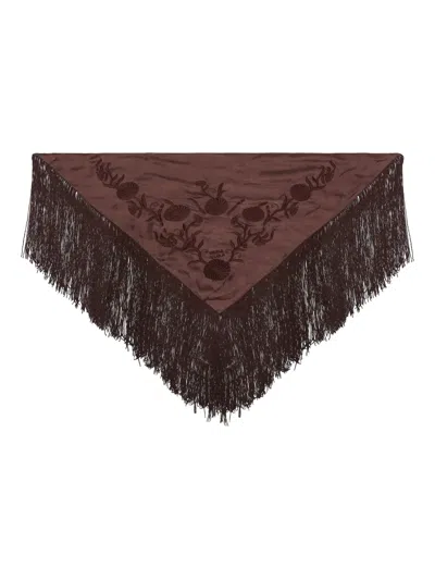 Floral-embroidered Fringed Scarf In Brown