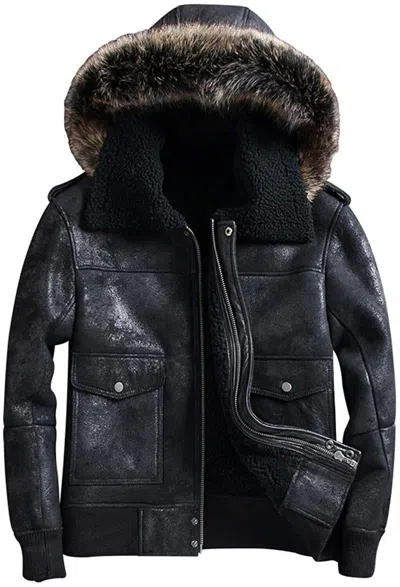 Pre-owned Men's Hooded Fox Fur Raf Aviator B3 Real Sheepskin Black Shearling Jacket