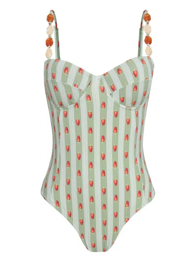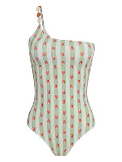 One-shoulder Stripe Strawberry-print Swimsuit In Green