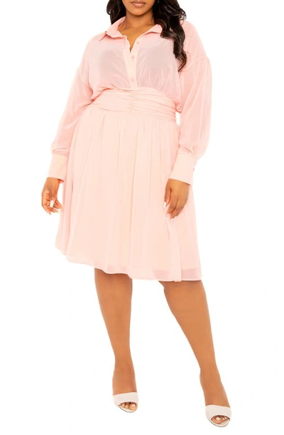 Cinch Waist Long Sleeve Chiffon Shirtdress In Pastel Pink