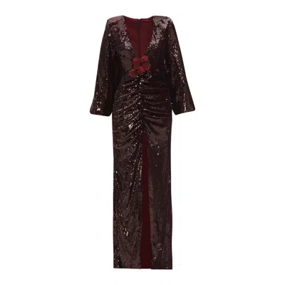 Women's Red Sequin Gown With Flower Detail In Burgundy
