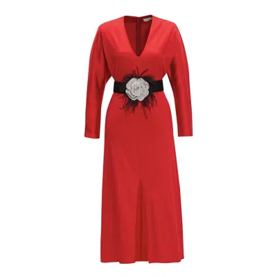 Women's V Neck Midi Dress With Front Slit In Red