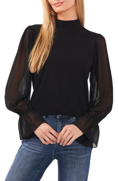 Sheer Sleeve Mock Neck Mixed Media Top In Black