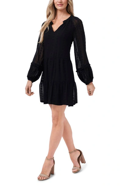Tiered Mock Neck Long Sleeve Shift Dress In Rich Black