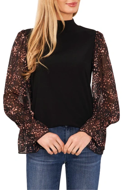 Daisy Puff Sleeve Mix Media Top In Rich Black