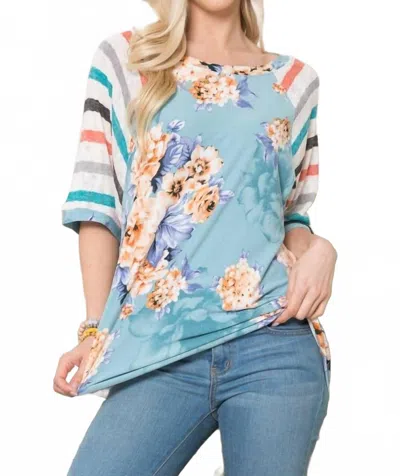 Denim Floral Stripe Sleeve Top - Plus In Blue