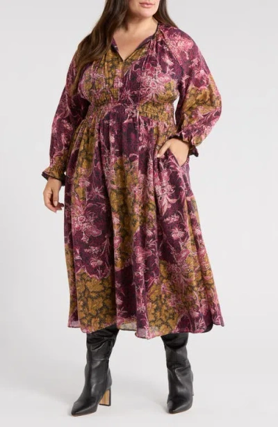 Long Sleeve Smocked Bodice Midi Dress In Purple