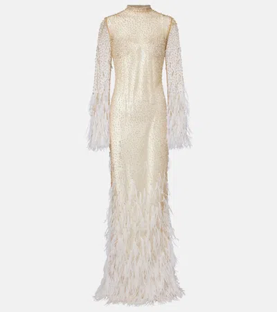 Mia Embellished Feather-trimmed Tulle Gown In Neutral