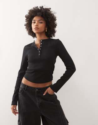 Long Sleeve Ribbed Henley Top In Black