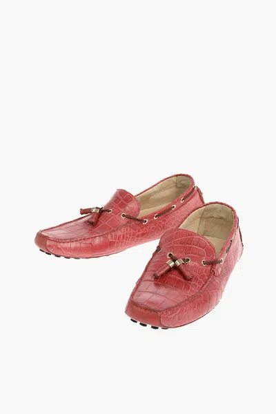 Crocodile Skin Boat Shoes With Pure Gold Embelished Tassels In Red