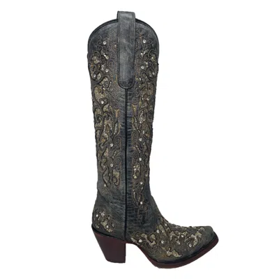 Pre-owned ® Ladies Embroidered Studded Inlay Distressed Black Snip Toe Boots A4344