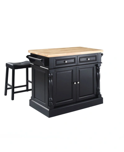 Oxford Butcher Block Top Kitchen Island With 24" Upholstered Square Seat Stools In Black