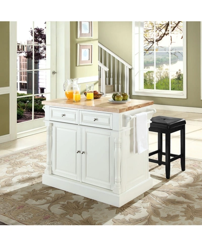 Oxford Butcher Block Top Kitchen Island With 24" Upholstered Square Seat Stools In White