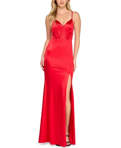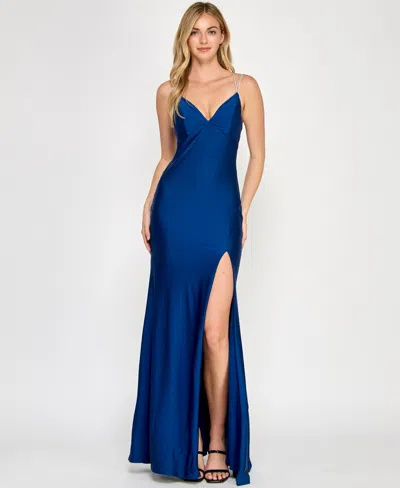 Juniors' Rhinestone-strap Lace-up-back Gown In Indigo