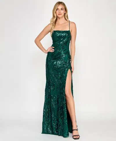Juniors' Sequined Lace-up-back Gown In Hunter