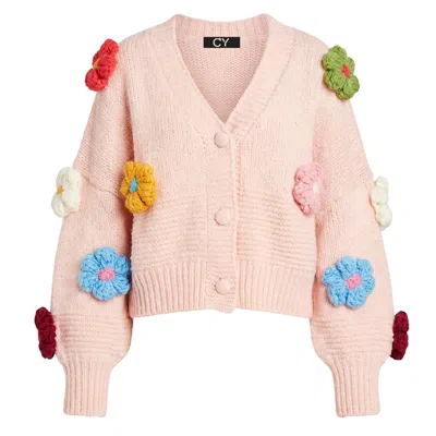 Women's Pink Chunky Hand-knit Floral Pattern Cardigan Cozy Oversized Fit
