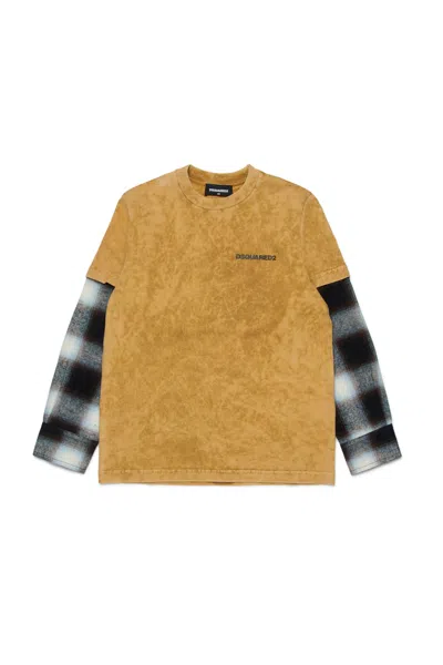 Kids' Jersey T-shirt With Plaid Sleeves In Brown