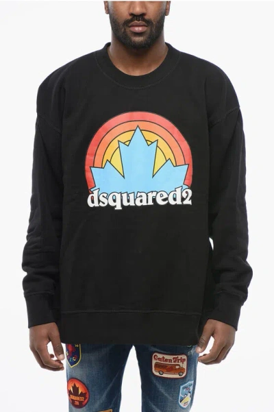 Crew Neck Rainbow Leaf Fleeced Cotton Sweatshirt In Black