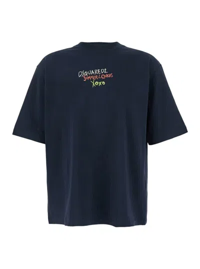Blue T‑shirt With Round Neck And Embroidered Logo On The Front