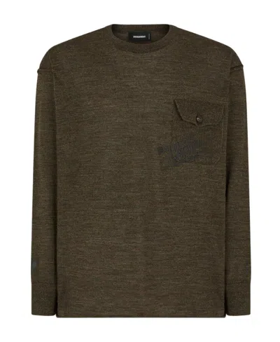 Virgin Wool Crew-neck Sweater With Breast Pocket In Brown