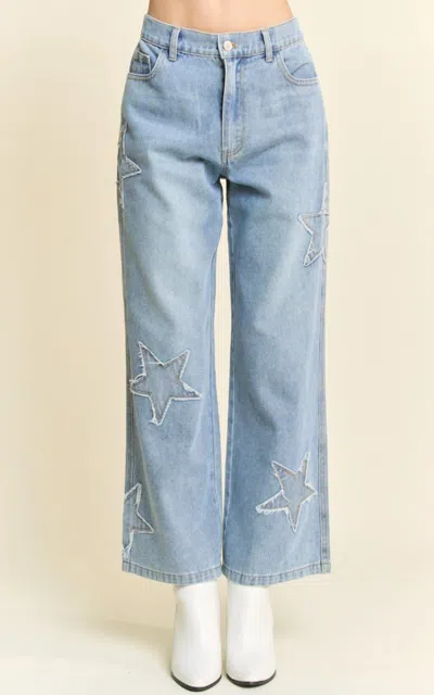 Star Patchwork Side Pocket Wide Leg Denim Pants In Light Blue
