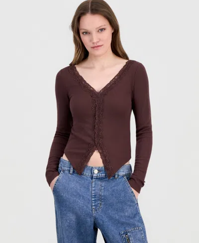 Juniors' Lace-trim Long-sleeve Ribbed Top In Brown