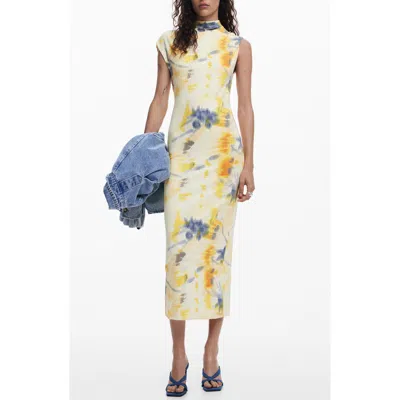 Blurred Floral Midi Dress In Yellow