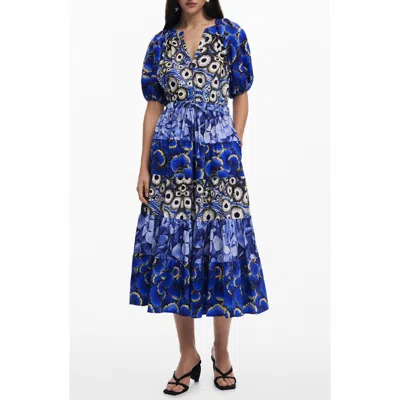 Mixed Print Tiered Midi Dress In Navy Blue