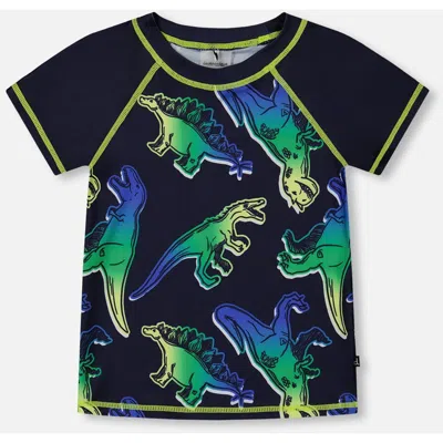 Babies' Little Boy's Short Sleeve Rashguard Blue And Green Dino On Navy