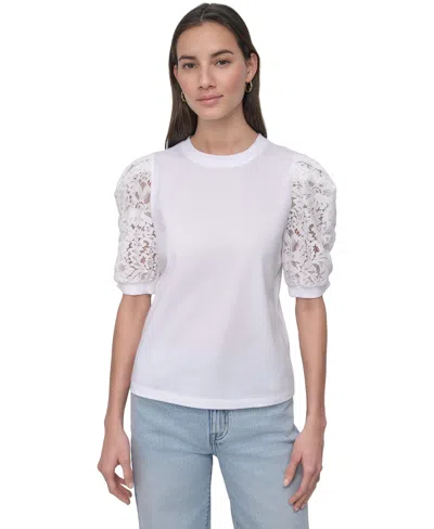 Women's Mixed Media Lace-sleeve Top In White
