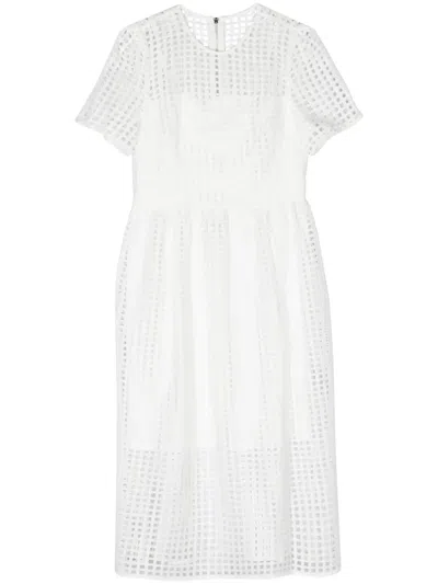 Grid Pattern Midi Dress With Jewel Neckline In White