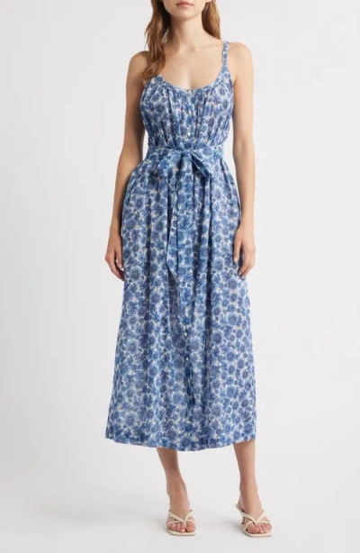 Ischia Shirred Floral-print Organic Cotton-voile Midi Dress In Blue