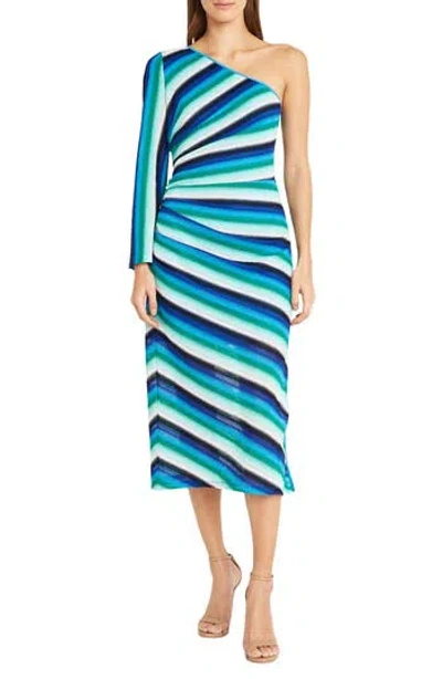 For Maggy Stripe Ruched One-shoulder Knit Midi Dress In Blu Comb 2