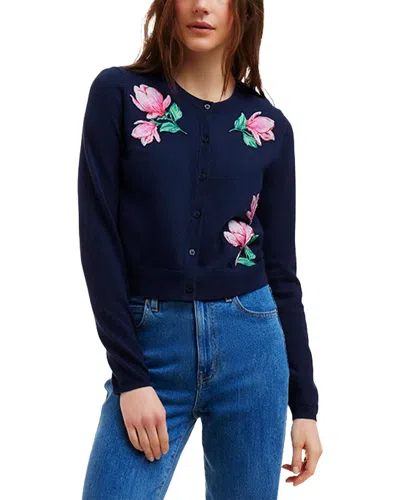Embroidered Crewneck Wool-blend Cardigan In Blue