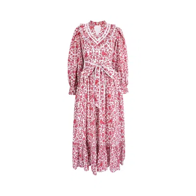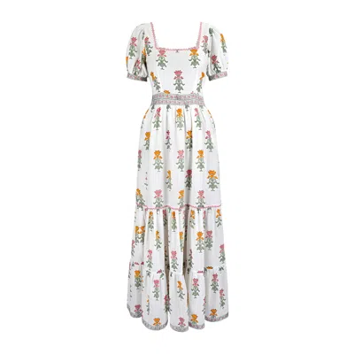 Women's Gold / Pink Sofia Ruffled Neck Hand Block Print Cotton Dress In White