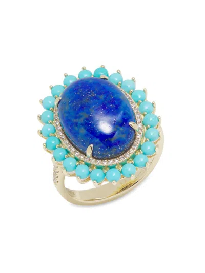 Women's 14k Yellow Gold, 12.40 Tcw Lapis & Turquoise & 0.27 Tcw Diamond Ring In Blue